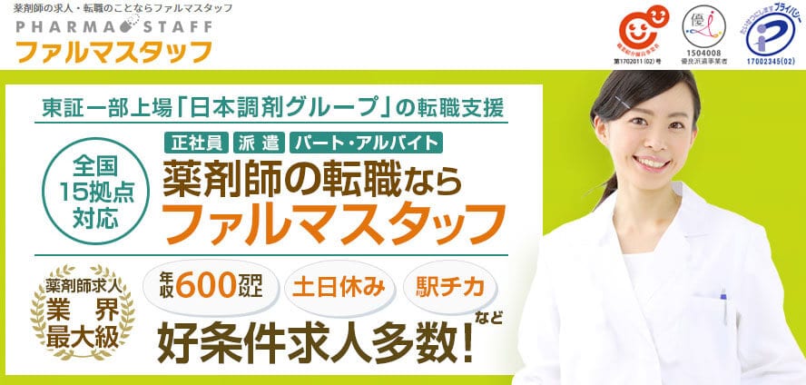 ファルマスタッフもマイナビ薬剤師と並んでトップクラスの求人数です。