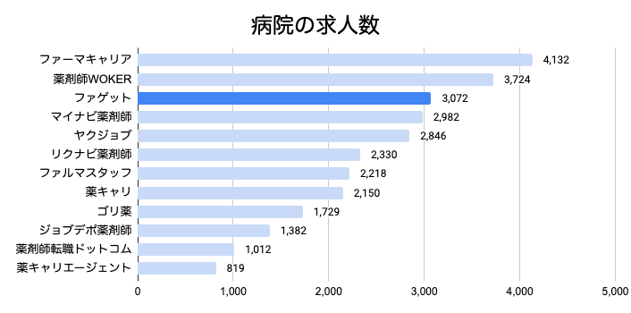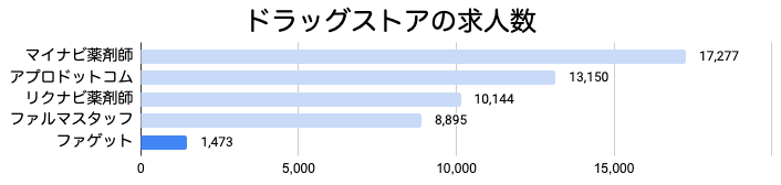 下記からも、大手の転職サイトに比べるとファゲットのドラッグストアの求人数は少ないことが読み取れます。