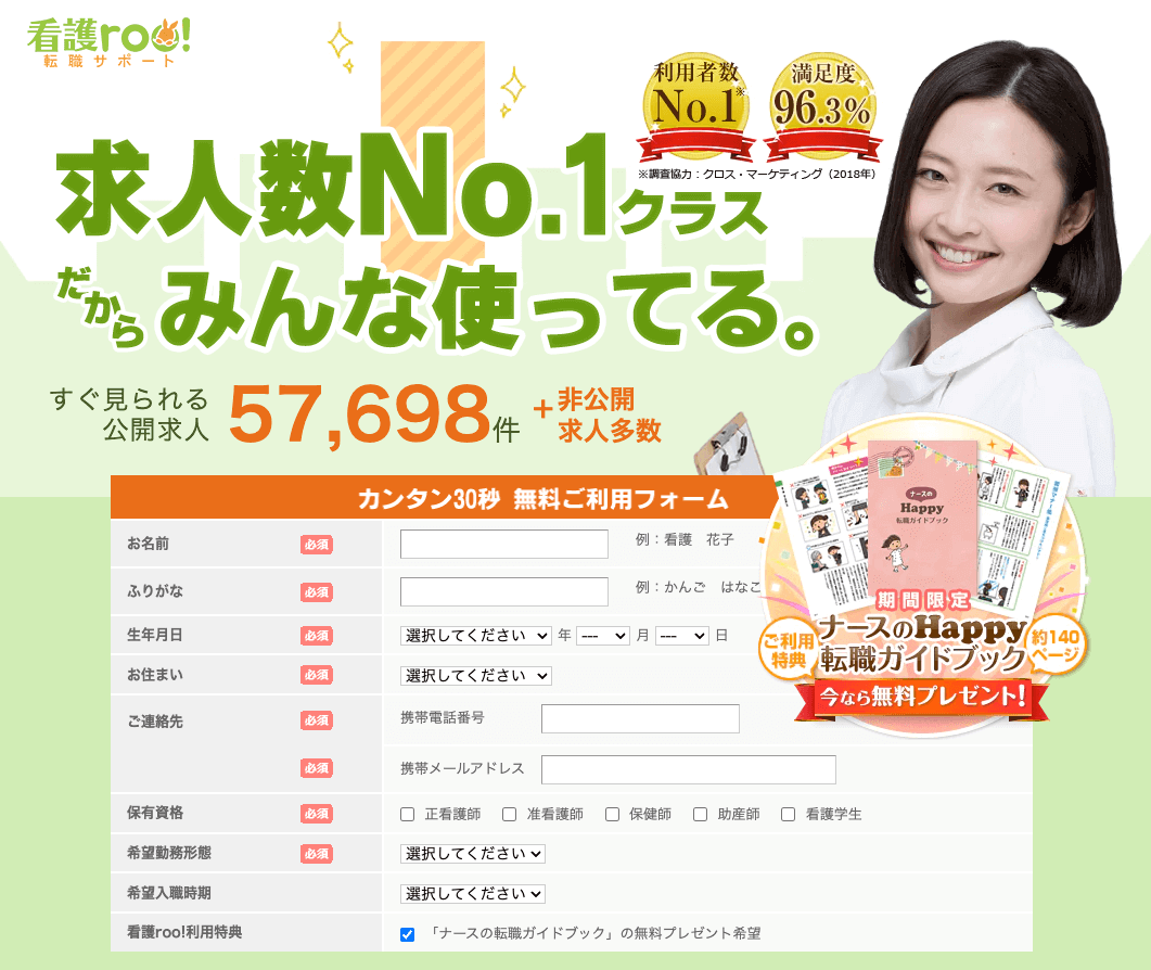 看護roo!は、きめ細かな情報提供とていねいなコンサルティングで高く評価されているため、初めて転職する方や新人看護師でも安心です。