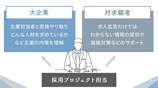 採用プロジェクト担当は、各企業1社ごとに1人が専任でつき、その企業の採用担当者と直接コミュニケーションを取りながら求職者に求人を紹介してくれます。