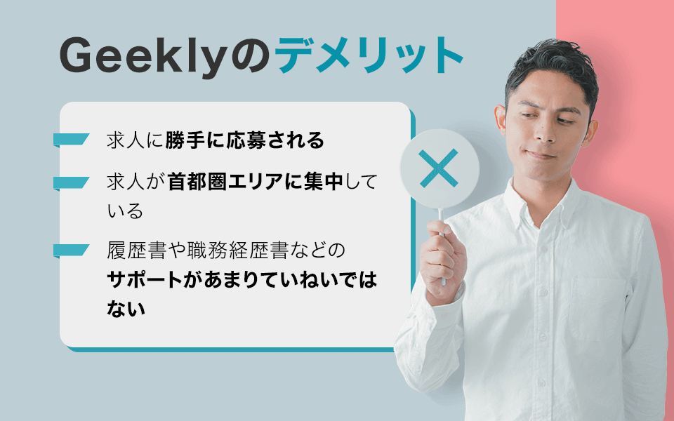 Geeklyの担当者のレベルに不満を感じました。面接会場を間違えて伝えられただけでなく、ミスした原因の説明もないなど不誠実な対応が重なったため良い印象がありません。ただ、この一件で担当者がマネージャークラスの方へ変わってからは、問題なく転職活動を進めることができました。