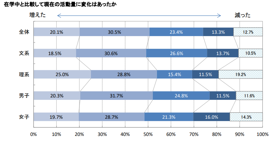 22.7%の人は在学中と活動量は変わらない、30.8%の人は活動量が減ったという結果になりました。