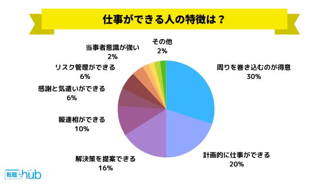 50人が選んだ仕事ができる人の特徴としてもっとも割合が大きかったのは「周りを巻き込むのが得意」です。