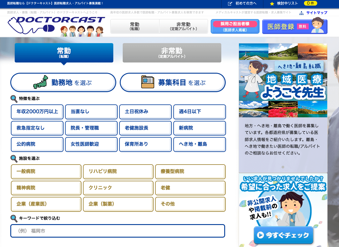 検索できる診療科目数もトップ(52科目)で、より詳細に絞って求人を探したい方に便利でしょう。