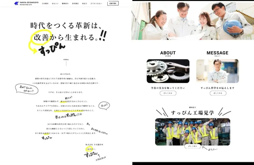 株式会社半谷製作所では、社員様それぞれがありのままで働けることが技術力の向上につながっていました。自然体で働けることを「すっぴん」という言葉で表現し、すっぴんでいられる環境の根源となる考えや、すっぴんだからこそ得られている半谷製作所の強みを、真面目な文章に脱力感のあるフォントで本音らしさを感じられる言葉が落書きされていくサイト上の演出で、会社としての真面目な考えとすっぴんの社風を表す広告を制作しました。
