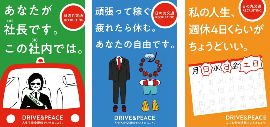 タクシー会社である日の丸交通株式会社では、仕事量や働く時間を自分で決め、働き方を自分らしくカスタマイズすることができます。日の丸交通株式会社には、実際に多様な働き方を支援する制度や文化が浸透していますが、学生にはその実態が見えづらく、業界イメージも相まってなかなか伝わりにくいものでした。この課題を解決するために、いたって真面目なコピーと少しユニークなイラストとともに表現することで、学生に伝わりやすい広告になるよう制作いたしました。