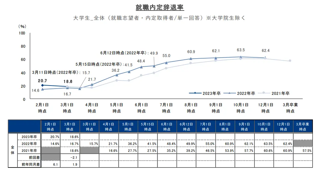 内定出し開始のピークも前倒しとなっている様子がうかがえることから、今後内定辞退・選考辞退は前年と比べて3月中に、より多く発生することが予想されます。