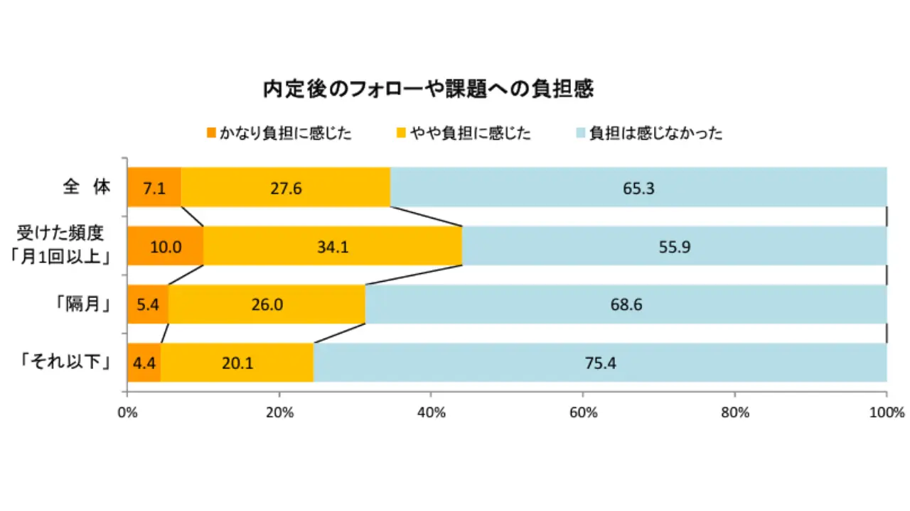 しかし、株式会社ディスコのキャリタスリサーチによると、内定後にフォローや課題を与えられた頻度が月に1回以上だった学生のうち、約半数は学業への負担を感じているというデータがあります。