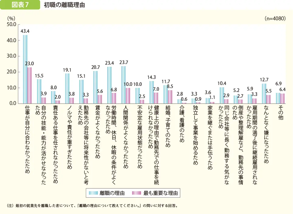 内閣府の調査では、初めての就職先を離職した理由(複数回答可)として、「仕事が自分に合わなかったため」が43.4%でトップ、次いで2位は「人間関係がよくなかったため」で23.7%、3位に「労働時間、休日、休暇の条件がよくなかったため」で23.4%となっています。
