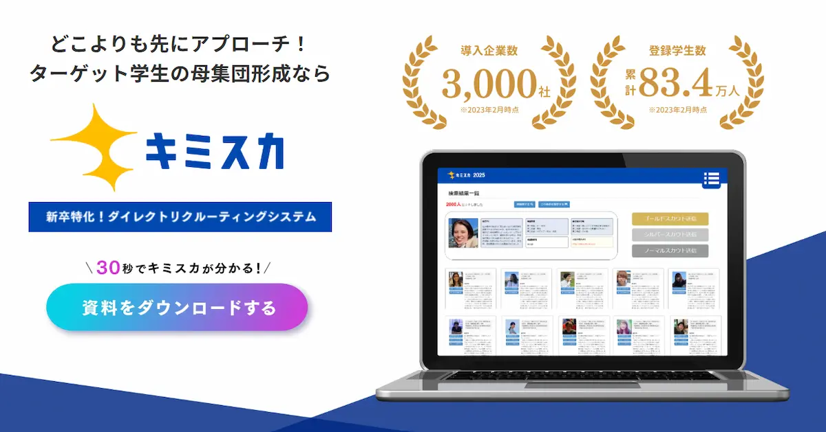 キミスカは、業界トップクラスの登録学生数と高いスカウトメール開封率が特徴の新卒ダイレクトリクルーティングサービス。