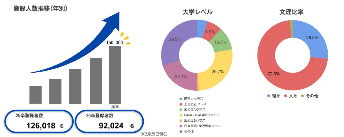キミスカの2024卒では約135,000人もの学生に利用されており、就活生の3人に1人が利用している計算になります。登録学生数は年々増加し、2025卒では15万人の登録を予想しています。