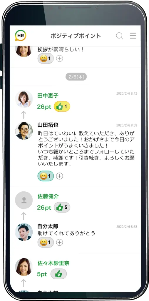 称賛メッセージは同僚全員が見ることができ、活躍の認知を広げることができます。また、称賛メッセージに便乗して外野からポイントを追加付与することも可能です。