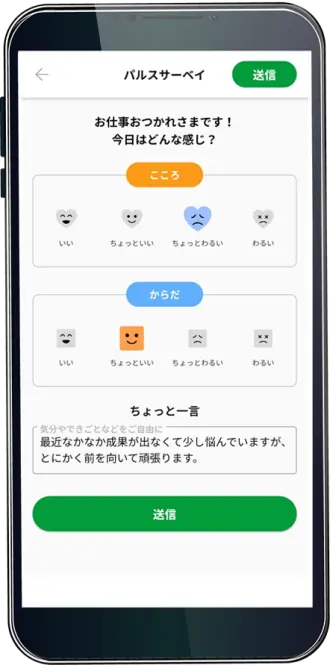 毎日こころとからだの状態をシェアしてもらうことで、手遅れになる前にリアルタイムで看護師の異変に気づくことができます。