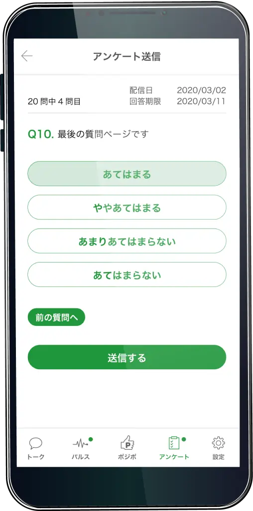 看護師、看護師長、事務局、ドクターなどアプリのユーザーとして登録した方同士で、自分の状態を定期的に近況報告し合っていただきます。回答頻度はお選びいただけますが、習慣化しやすい1日1回がオススメです。
