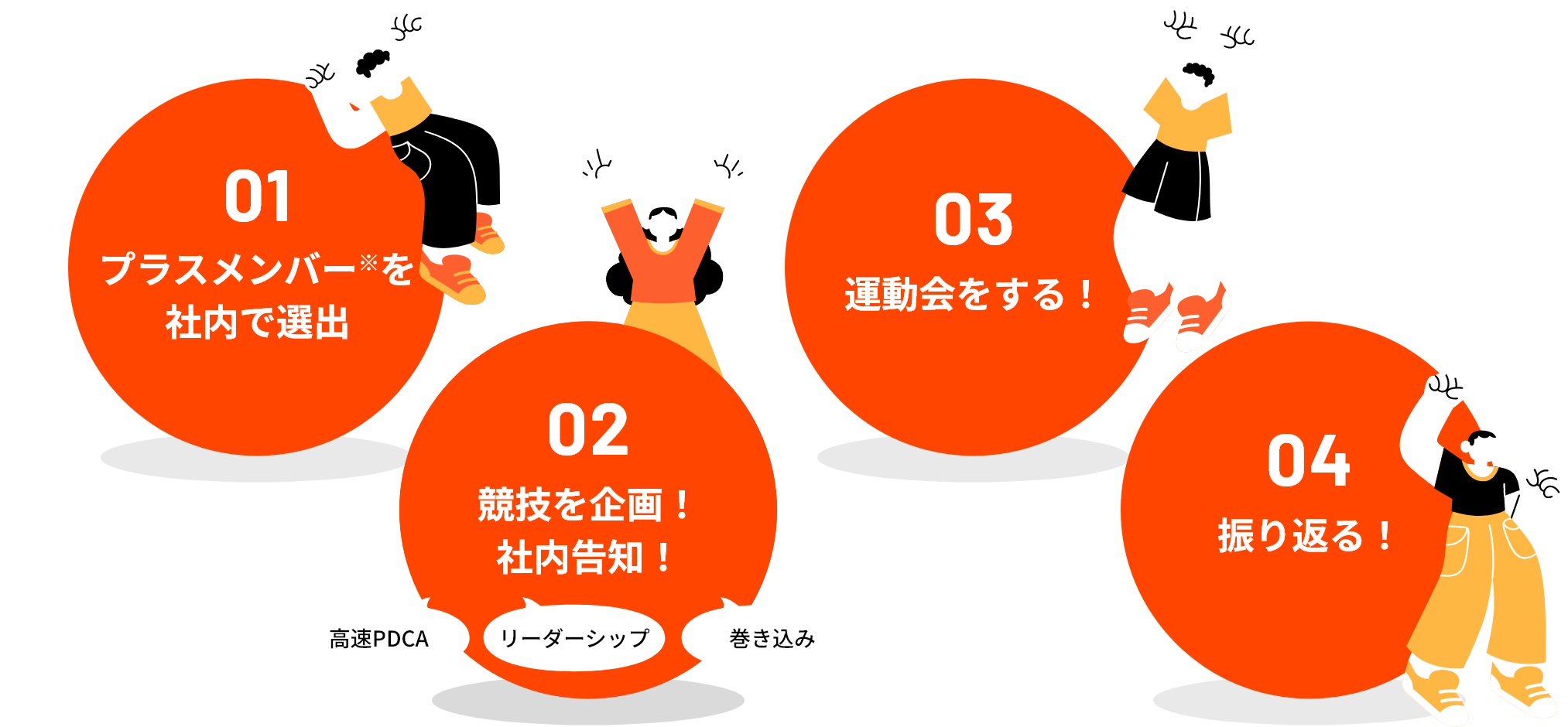※ プラスメンバーとは? 運動会プラスを使って成長してほしい研修受講メンバーを指します。プラスメンバーは必要とされるビジネススキルを学び、運動会の企画を通して実際に行動し、実践していきます。
